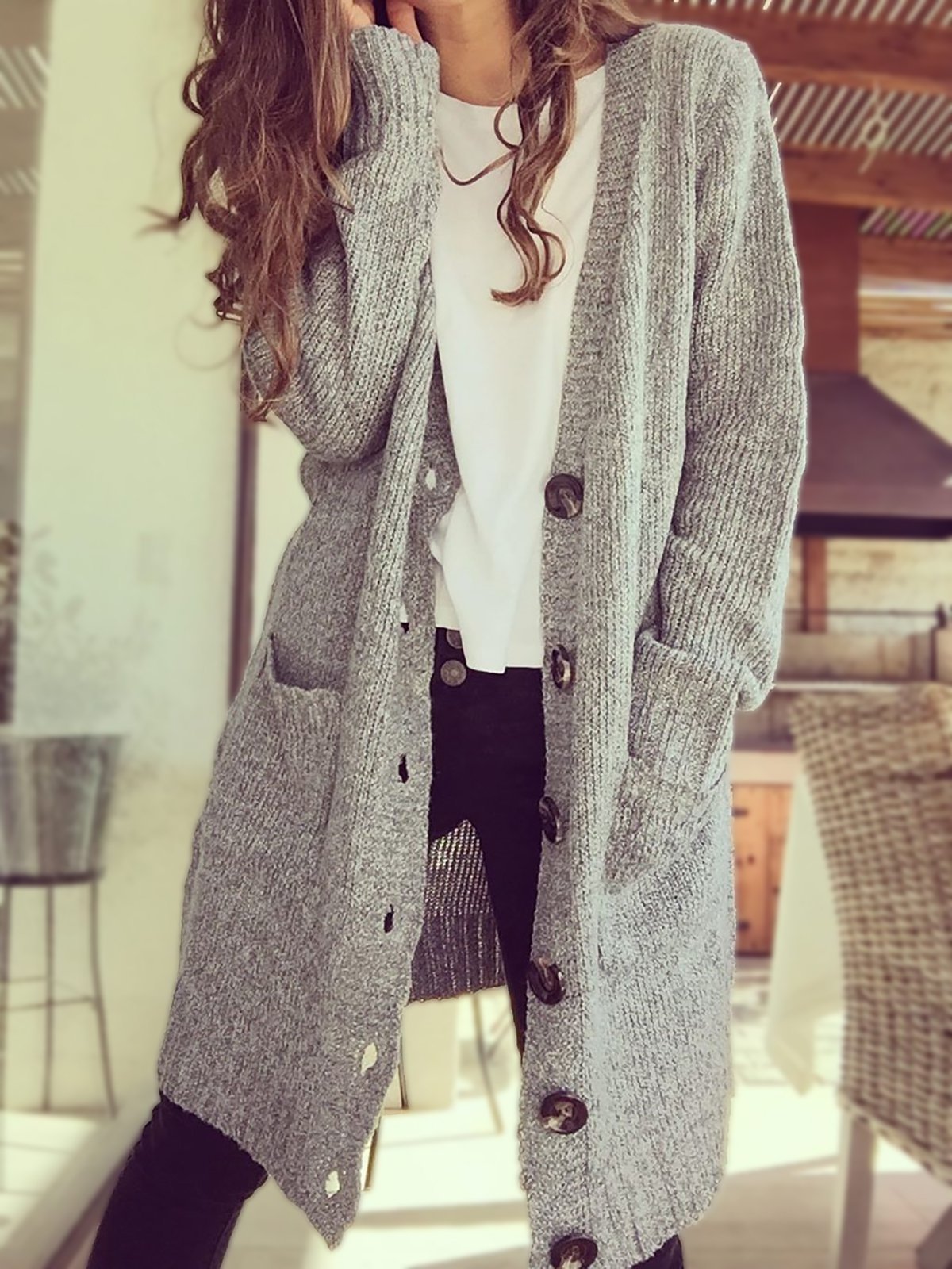 Button Down Long Knitted Cardigan Doble Pockets Plus Size Outerwear